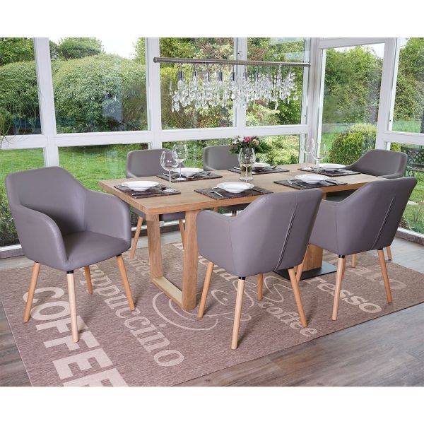 Die hellen Beine aus robustem Holz bilden einen stilvollen Kontrast zum Taupe-Grau des Kunstleders und verleihen den Stühlen eine luftige Leichtigkeit. Die leicht ausgestellten Beine sind nicht nur ein optisches Highlight, sondern sorgen auch für einen sicheren Stand. So können Sie sich entspannt zurücklehnen und das Essen oder die Gesellschaft Ihrer Lieben genießen.