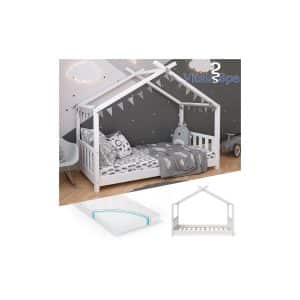VITALISPA Kinderbett Hausbett DESIGN 80x160cm Natur Zaun Kinder Holz Haus Hausbett mit Matratze