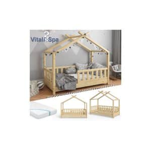 VITALISPA Kinderbett Hausbett DESIGN 70x140cm Natur Zaun Kinder Holz Haus Hausbett