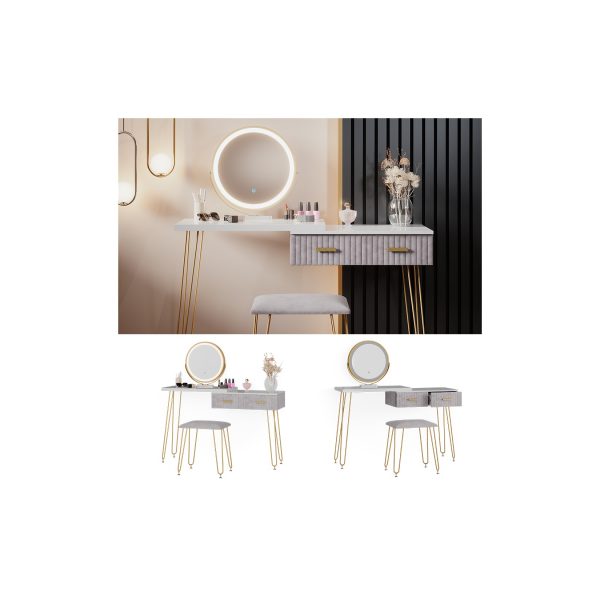 Der Vicco Schminktisch Zoey besticht durch sein zeitloses Design, das sich nahtlos in jedes moderne Schlafzimmer einfügt. Die klaren Linien, die elegante Farbkombination aus Weiß und Grau und der integrierte LED-Spiegel verleihen dem Tisch eine luxuriöse Ausstrahlung. Der bequeme Design-Hocker rundet das Gesamtbild ab und sorgt für optimalen Komfort während deiner Beauty-Routine.