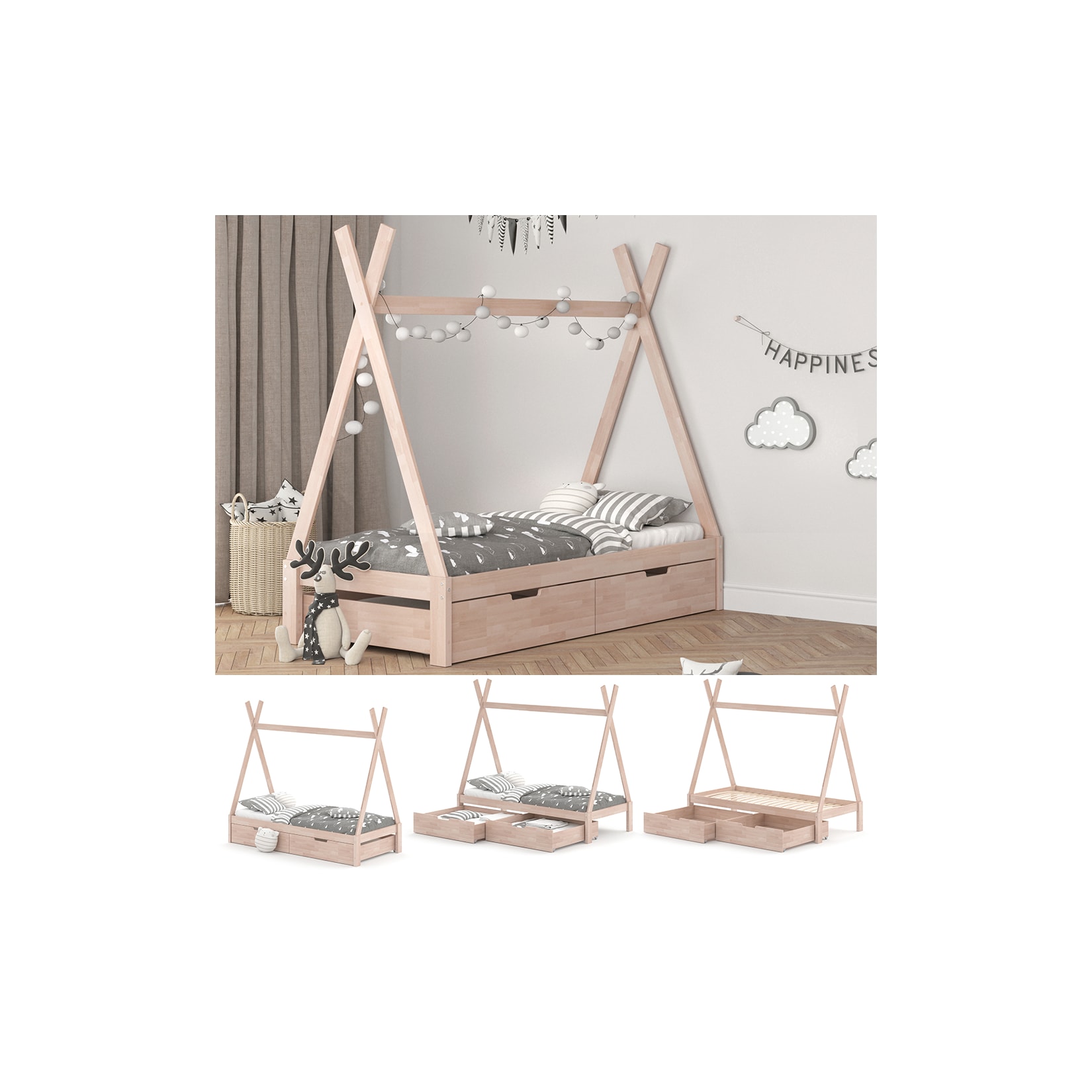 Das charakteristische Tipi-Design des Bettes regt die Fantasie Ihres Kindes an und lädt zu kreativen Rollenspielen ein. Ob als geheimes Versteck, als gemütliche Leseecke oder als Basis für spannende Abenteuer – das Tipi-Hausbett bietet unzählige Möglichkeiten, die kindliche Vorstellungskraft zu beflügeln. Die offene Bauweise sorgt dabei für ausreichend Licht und Luftzirkulation, während das robuste Gestell aus massivem Holz für Stabilität und Sicherheit sorgt.