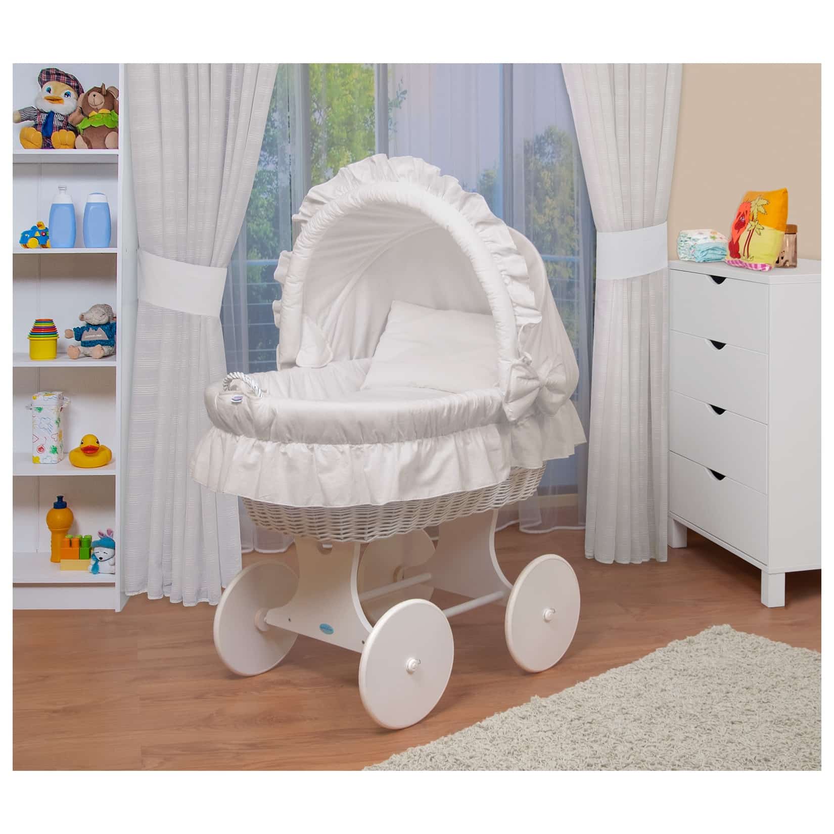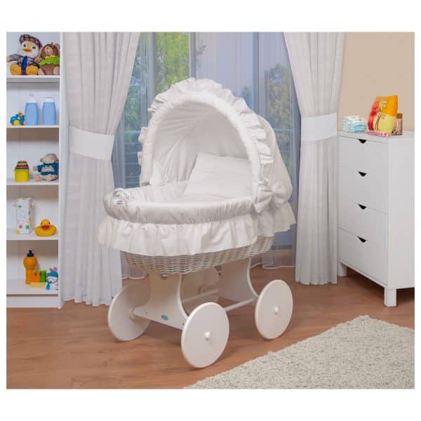 - Stabiler Stubenwagenrahmen: Aus massivem Holz gefertigt und weiß lackiert, bietet er eine sichere und stabile Basis.